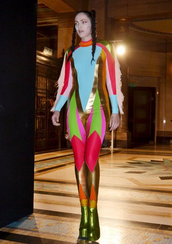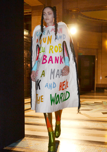 Much adored for her outlandish input into the London fashion scene, Pam Hogg’s latest collection continued to cement her reputation as a punk provocateur. Featuring a riotous palette in bold and neon shades is not intended for shrinking violets neither are the psychedelic overtones and anarchic statements.