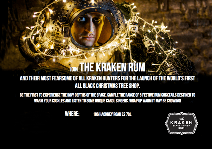 Here’s a heads up on something a little bit different for Christmas. There’ll be only 5 days next week to get yourselves to Kraken Black Spiced Rum’s pop-up bar ‘Kraken Think Ink Pines Shop’ on Hackney Road for some very special Kraken cocktails and black Christmas trees. You heard me right: BLACK CHRISTMAS TREES and KRAKEN BLACK SPICED RUM COCKTAILS!