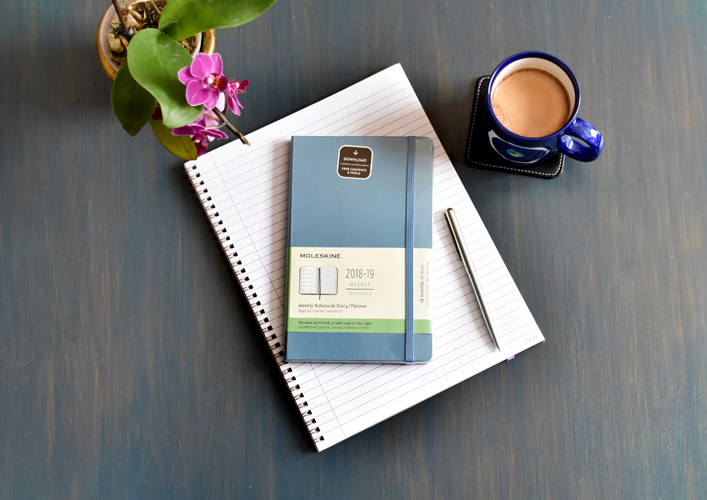 *The Moleskine 18-Month Weekly Notebook Diary/Planner in cool blue runs from July to December of the following year. Each two-page spread is laid out to show the week’s events on the left and a lined page for notes, ideas and to-do lists on the right. This popular planner style is perfect for students, teachers and professionals (or if you have still not gotten around to buy a diary for this year.