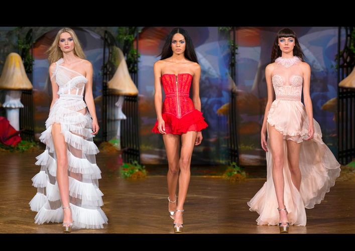 The beautiful garden setting of the show enhanced this mood – with vibrant colours against black and white, signifying the innocence of childhood against the mysterious world which lies ahead. The Aadnevik name for the show is embroidered with hearts and stars which is inspired by the book. Their signature leather craftsmanship is defined in the waistline of each piece and used in the elegant layering of the dresses, providing such delicate and exquisite detail throughout the garments. French lace intricately portrays the wild world of Alice in Wonderland, along with finely pleated tulle creating luxurious layers and a fine translucence throughout the gowns. In an imaginary world full of beautiful flowers, ornaments and animals; the gowns are adorned with shining metallics and paths of handcrafted beads and bugs throughout; emanating this feel of the dream that is Wonderland – a journey of loss, hope, madness and love.